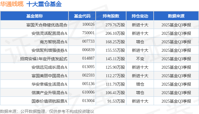 持有华通线缆最多的基金为富国天合稳健优选混合,目前规模为24.64亿元,最新净值1.6487(10月29日),较上一交易日上涨1.11%,近一年上涨15.17%。该基金现任基金经理为张啸伟。