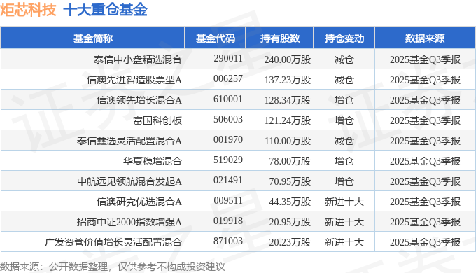 持有炬芯科技最多的基金为泰信中小盘精选混合,目前规模为17.22亿元,最新净值4.468(10月29日),较上一交易日下跌0.16%,近一年上涨58.02%。该基金现任基金经理为董季周。