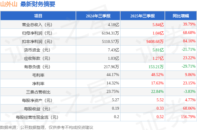 据证券之星公开数据整理,近期山外山(688410)发布2025年三季报。截至本报告期末,公司营业总收入5.84亿元,同比上升39.79%,归母净利润1.04亿元,同比上升68.68%。按单季度数据看,第三季度营业总收入2.27亿元,同比上升61.66%,第三季度归母净利润4944.88万元,同比上升205.5%。本报告期山外山盈利能力上升,毛利率同比增幅2.07%,净利率同比增幅23.15%。