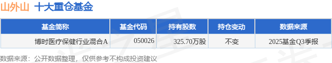 持有山外山最多的基金为博时医疗保健行业混合A,目前规模为20.25亿元,最新净值2.542(10月29日),较上一交易日上涨0.0%,近一年上涨5.52%。该基金现任基金经理为陈西铭。