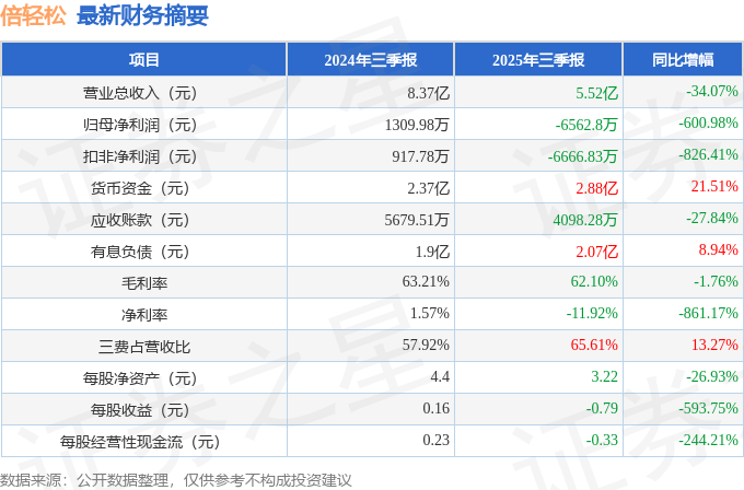 据证券之星公开数据整理,近期倍轻松(688793)发布2025年三季报。截至本报告期末,公司营业总收入5.52亿元,同比下降34.07%,归母净利润-6562.8万元,同比下降600.98%。按单季度数据看,第三季度营业总收入1.67亿元,同比下降28.51%,第三季度归母净利润-2951.33万元,同比下降126.43%。本报告期倍轻松公司应收账款体量较大,当期应收账款占最新年报归母净利润比达399.71%。