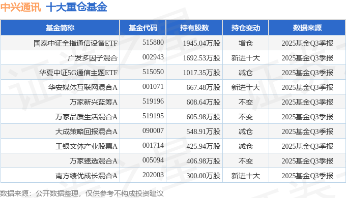 持有中兴通讯最多的基金为国泰中证全指通信设备ETF,目前规模为115.52亿元,最新净值2.9631(10月29日),较上一交易日上涨1.54%,近一年上涨108.2%。该基金现任基金经理为艾小军。