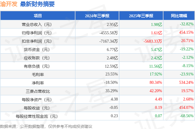 据证券之星公开数据整理,近期渝开发(000514)发布2025年三季报。根据财报显示,渝开发净利润同比增长454.15%。截至本报告期末,公司营业总收入1.98亿元,同比下降32.82%,归母净利润1.61亿元,同比上升454.15%。按单季度数据看,第三季度营业总收入5672.99万元,同比下降49.08%,第三季度归母净利润-3206.77万元,同比下降153.37%。
