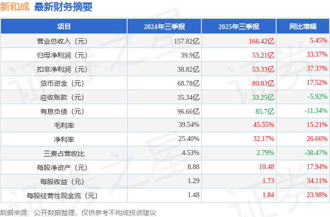 据证券之星公开数据整理,近期新和成(002001)发布2025年三季报。截至本报告期末,公司营业总收入166.42亿元,同比上升5.45%,归母净利润53.21亿元,同比上升33.37%。按单季度数据看,第三季度营业总收入55.41亿元,同比下降6.66%,第三季度归母净利润17.17亿元,同比下降3.8%。本报告期新和成盈利能力上升,毛利率同比增幅15.21%,净利率同比增幅26.66%。