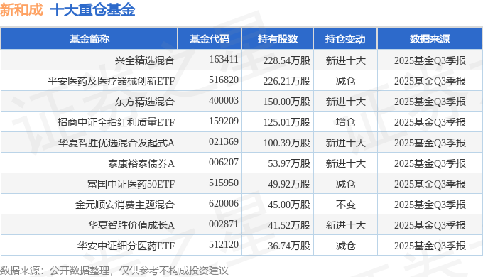 持有新和成最多的基金为兴全精选混合,目前规模为21.08亿元,最新净值3.1092(10月29日),较上一交易日上涨2.02%,近一年上涨26.49%。该基金现任基金经理为陈宇。