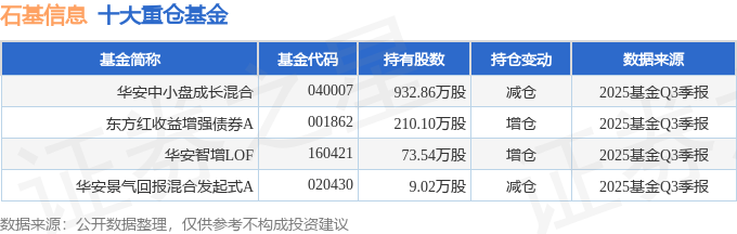 持有石基信息最多的基金为华安中小盘成长混合,目前规模为20.0亿元,最新净值3.0754(10月29日),较上一交易日上涨0.91%,近一年上涨9.81%。该基金现任基金经理为金拓。