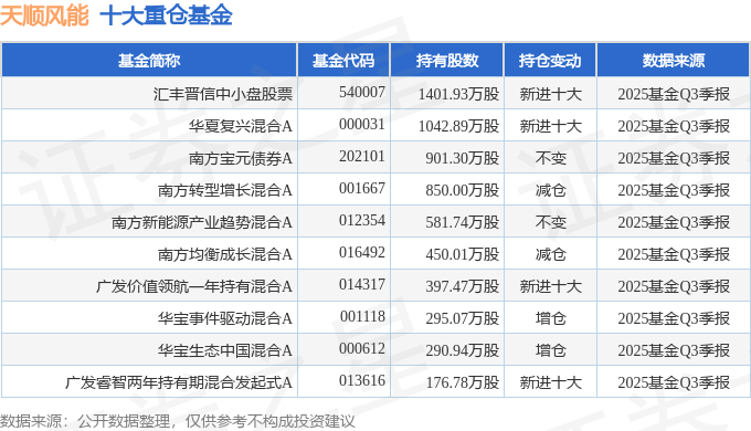 持有天顺风能最多的基金为汇丰晋信中小盘股票,目前规模为14.93亿元,最新净值3.4671(10月29日),较上一交易日上涨0.91%,近一年上涨41.6%。该基金现任基金经理为郑小兵。