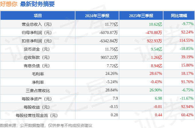 据证券之星公开数据整理,近期好想你(002582)发布2025年三季报。截至本报告期末,公司营业总收入10.62亿元,同比下降9.77%,归母净利润-470.88万元,同比上升92.24%。按单季度数据看,第三季度营业总收入3.74亿元,同比上升3.51%,第三季度归母净利润1513.0万元,同比上升161.82%。本报告期好想你盈利能力上升,毛利率同比增幅18.17%,净利率同比增幅91.76%。