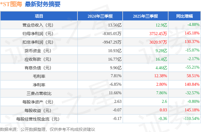 据证券之星公开数据整理,近期*ST围海(002586)发布2025年三季报。截至本报告期末,公司营业总收入12.9亿元,同比下降4.88%,归母净利润3752.45万元,同比上升145.18%。按单季度数据看,第三季度营业总收入4.6亿元,同比下降6.25%,第三季度归母净利润2919.67万元,同比上升191.41%。本报告期*ST围海盈利能力上升,毛利率同比增幅58.51%,净利率同比增幅140.84%。