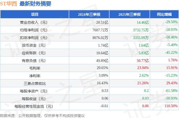 据证券之星公开数据整理,近期ST华西(002630)发布2025年三季报。截至本报告期末,公司营业总收入14.46亿元,同比下降29.5%,归母净利润3732.75万元,同比下降50.93%。按单季度数据看,第三季度营业总收入4.24亿元,同比下降25.4%,第三季度归母净利润115.53万元,同比下降91.73%。本报告期ST华西短期债务压力上升,流动比率达0.56。