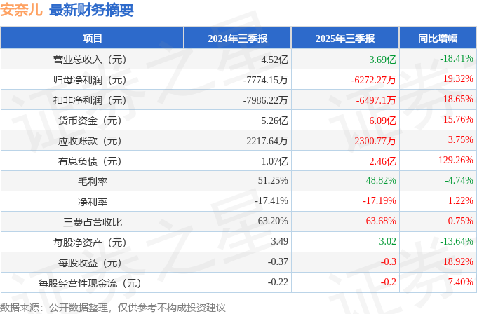据证券之星公开数据整理,近期安奈儿(002875)发布2025年三季报。根据财报显示,安奈儿亏损收窄。截至本报告期末,公司营业总收入3.69亿元,同比下降18.41%,归母净利润-6272.27万元,同比上升19.32%。按单季度数据看,第三季度营业总收入1.06亿元,同比下降2.36%,第三季度归母净利润-3402.39万元,同比上升28.61%。