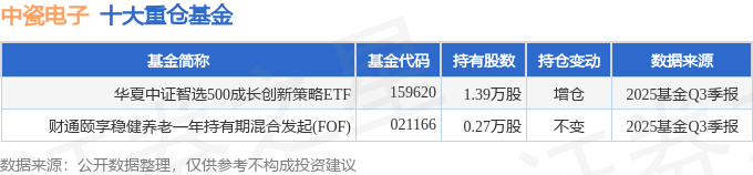 持有中瓷电子最多的基金为华夏中证智选500成长创新策略ETF,目前规模为0.59亿元,最新净值1.1912(10月29日),较上一交易日上涨1.57%,近一年上涨23.96%。该基金现任基金经理为荣膺。