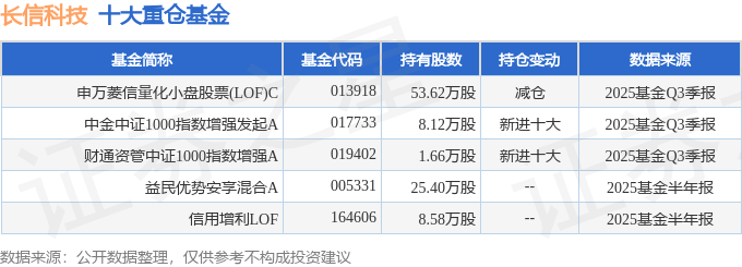 持有长信科技最多的基金为申万菱信量化小盘股票(LOF)C,目前规模为0.49亿元,最新净值2.3417(10月29日),较上一交易日上涨0.22%,近一年上涨31.28%。该基金现任基金经理为夏祥全。