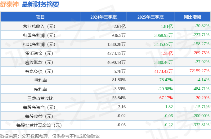 据证券之星公开数据整理,近期舒泰神(300204)发布2025年三季报。根据财报显示,舒泰神净利润同比下降227.71%。截至本报告期末,公司营业总收入1.81亿元,同比下降30.82%,归母净利润-3068.95万元,同比下降227.71%。按单季度数据看,第三季度营业总收入5494.11万元,同比下降30.1%,第三季度归母净利润-605.4万元,同比下降1.89%。