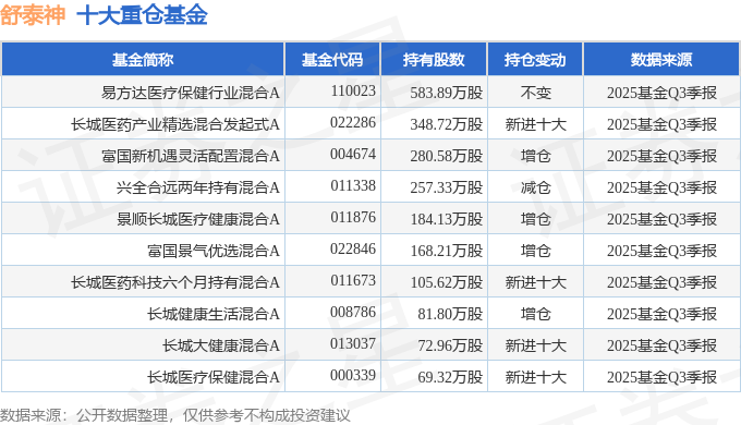 持有舒泰神最多的基金为易方达医疗保健行业混合A,目前规模为38.02亿元,最新净值4.072(10月29日),较上一交易日下跌0.17%,近一年上涨22.03%。该基金现任基金经理为杨桢霄。
