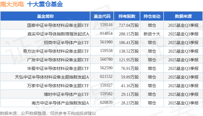 持有南大光电最多的基金为国泰中证半导体材料设备主题ETF,目前规模为82.99亿元,最新净值1.5417(10月29日),较上一交易日上涨0.33%,近一年上涨47.84%。该基金现任基金经理为艾小军。