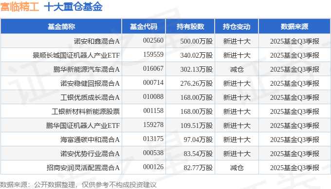 持有富临精工最多的基金为诺安和鑫混合A,目前规模为21.74亿元,最新净值2.3334(10月29日),较上一交易日上涨0.06%,近一年上涨56.84%。该基金现任基金经理为陈衍鹏。