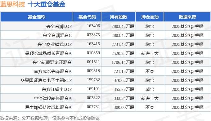 持有蓝思科技最多的基金为兴全合润LOF,目前规模为249.14亿元,最新净值2.1604(10月29日),较上一交易日上涨1.7%,近一年上涨38.39%。该基金现任基金经理为谢治宇。