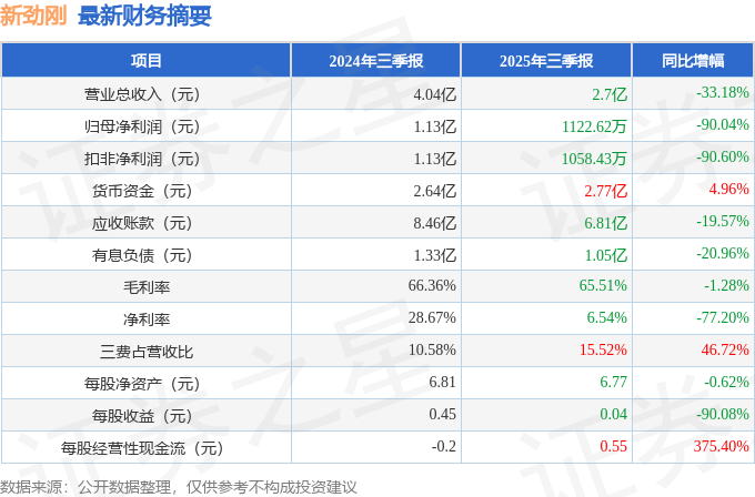 据证券之星公开数据整理,近期新劲刚(300629)发布2025年三季报。截至本报告期末,公司营业总收入2.7亿元,同比下降33.18%,归母净利润1122.62万元,同比下降90.04%。按单季度数据看,第三季度营业总收入1.08亿元,同比下降16.49%,第三季度归母净利润362.48万元,同比下降89.37%。本报告期新劲刚三费占比上升明显,财务费用、销售费用和管理费用总和占总营收同比增幅达46.72%。