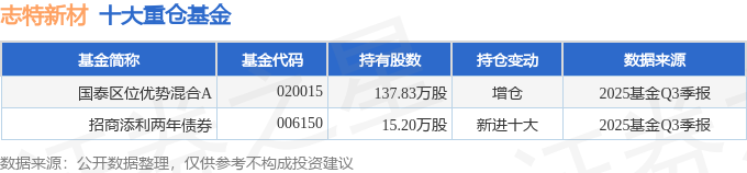 持有志特新材最多的基金为国泰区位优势混合A,目前规模为2.45亿元,最新净值4.7279(10月29日),较上一交易日上涨0.81%,近一年上涨29.19%。该基金现任基金经理为智健。