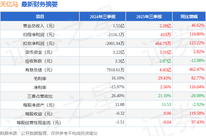 据证券之星公开数据整理,近期天亿马(301178)发布2025年三季报。截至本报告期末,公司营业总收入2.28亿元,同比上升46.62%,归母净利润419.0万元,同比上升119.8%。按单季度数据看,第三季度营业总收入8204.05万元,同比上升24.19%,第三季度归母净利润-186.91万元,同比上升80.19%。本报告期天亿马存货明显上升,存货同比增幅达134.03%。