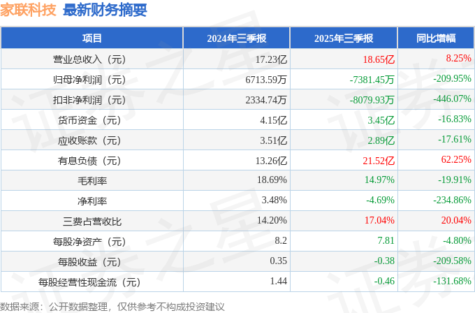 据证券之星公开数据整理,近期家联科技(301193)发布2025年三季报。截至本报告期末,公司营业总收入18.65亿元,同比上升8.25%,归母净利润-7381.45万元,同比下降209.95%。按单季度数据看,第三季度营业总收入7.42亿元,同比上升13.12%,第三季度归母净利润-914.47万元,同比下降268.27%。本报告期家联科技公司应收账款体量较大,当期应收账款占最新年报归母净利润比达507.59%。