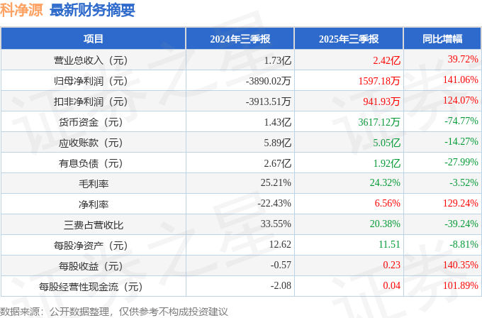 据证券之星公开数据整理,近期科净源(301372)发布2025年三季报。截至本报告期末,公司营业总收入2.42亿元,同比上升39.72%,归母净利润1597.18万元,同比上升141.06%。按单季度数据看,第三季度营业总收入9277.54万元,同比上升74.57%,第三季度归母净利润314.18万元,同比上升167.67%。本报告期科净源公司应收账款体量较大,当期应收账款占最新年报营业总收入比达264.13%。