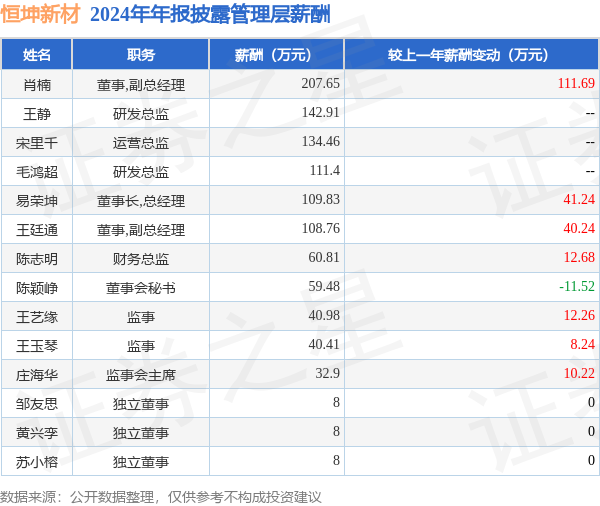 证券之星消息,恒坤新材发布2024年年报,数据显示:公司主营收入5.48亿元,同比增49.01%。归母净利润为9691.92万元,同比增7.87%。扣非净利润为9430.36万元,同比增15.67%。当年公司员工总数347人,同比增14.52%。人均薪酬29.7万元(注:"人均薪酬"根据定期报告中"应付职工薪酬"附注的本期增加值 / 员工总数计算而来),同比增22.42%。人均创收157.91万元,同比增30.12%。人均创利27.93万元,同比减5.73%。其中管理层薪酬总额为1073.59万元,同比上一年增30.52%,薪酬最高的为董事,副总经理肖楠,薪酬207.65万元。