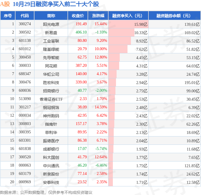 A股融资净买入前三分别为:阳光电源(300274)融资净买入15.98亿元、新易盛(300502)融资净买入10.33亿元、工业富联(601138)融资净买入8.92亿元,前20具体见下表: