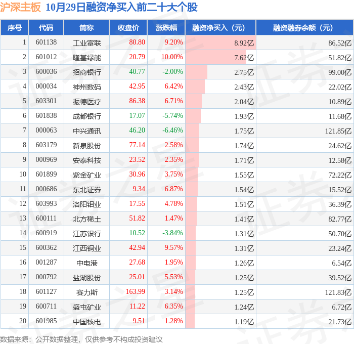 沪深主板融资净买入前三分别为:工业富联(601138)融资净买入8.92亿元、隆基绿能(601012)融资净买入7.62亿元、招商银行(600036)融资净买入2.75亿元,前20具体见下表: