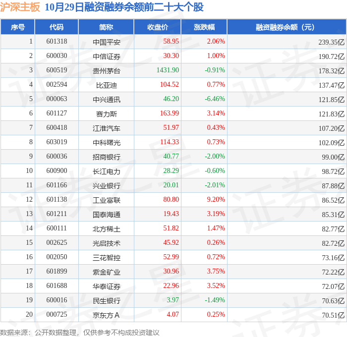 沪深主板融资融券余额前三分别为:中国平安(601318)融资融券余额239.35亿元、中信证券(600030)融资融券余额190.72亿元、贵州茅台(600519)融资融券余额178.32亿元,前20具体见下表: