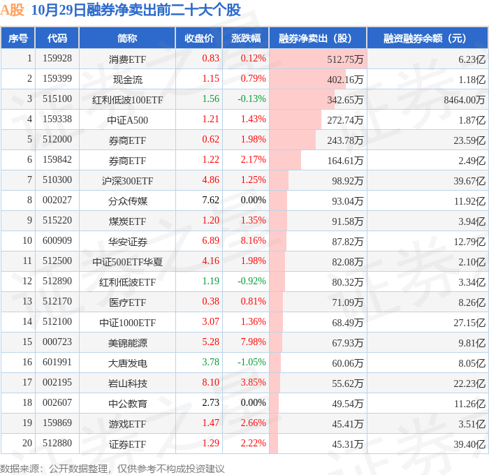 A股融券净卖出前三分别为:消费ETF(159928)融券净卖出512.75万股、现金流(159399)融券净卖出402.16万股、红利低波100ETF(515100)融券净卖出342.65万股,前20具体见下表: