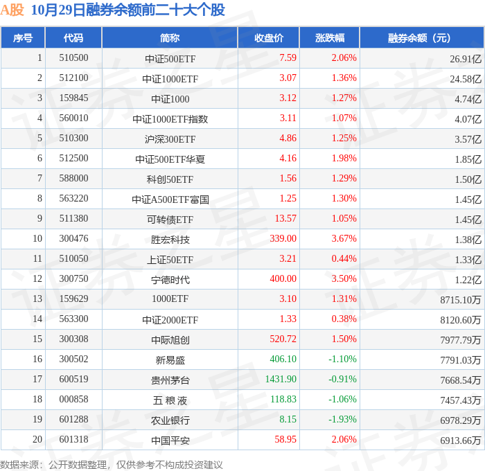A股融券余额前三分别为:中证500ETF(510500)融券余额26.91亿元、中证1000ETF(512100)融券余额24.58亿元、中证1000(159845)融券余额4.74亿元,前20具体见下表: