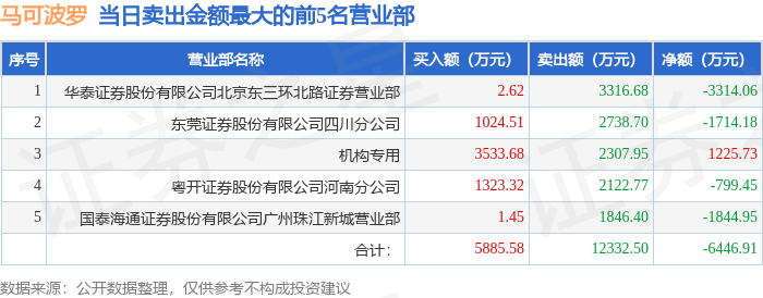 证券之星消息,沪深交易所2025年10月30日公布的交易公开信息显示,马可波罗(001386)因日换手率达到20%的前5只证券登上龙虎榜。此次是近5个交易日内第2次上榜。