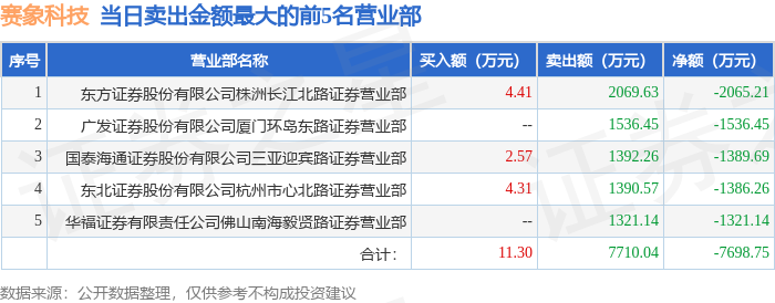 证券之星消息,沪深交易所2025年10月30日公布的交易公开信息显示,赛象科技(002337)因日跌幅偏离值达到7%的前5只证券登上龙虎榜。此次是近5个交易日内第2次上榜。