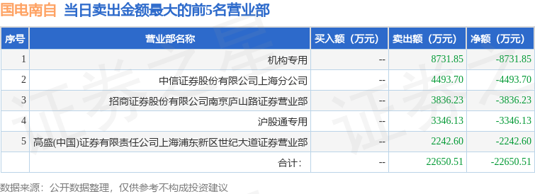 证券之星消息,沪深交易所2025年10月30日公布的交易公开信息显示,国电南自(600268)因有价格涨跌幅限制的日收盘价格跌幅偏离值达到7%的前五只证券登上龙虎榜。此次是近5个交易日内第1次上榜。