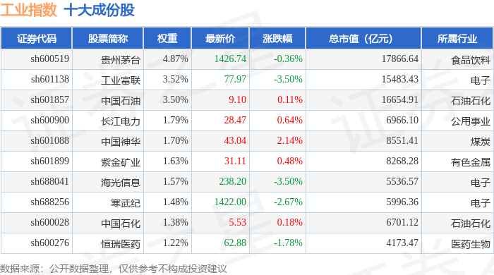 工业指数(000004)十大成份股详情如下: