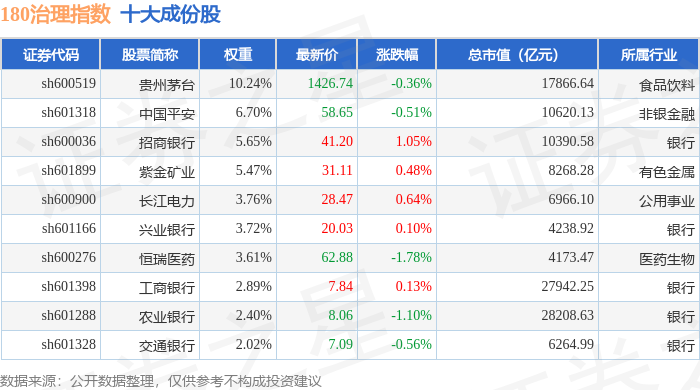 证券之星消息,10月30日,180治理(000021)指数报收于1076.14点,跌0.07%,成交1431.0亿元,换手率0.44%。当日该指数成份股中,上涨的有48家,中远海能以8.76%的涨幅领涨,下跌的有49家,晶晨股份以9.71%的跌幅领跌。
