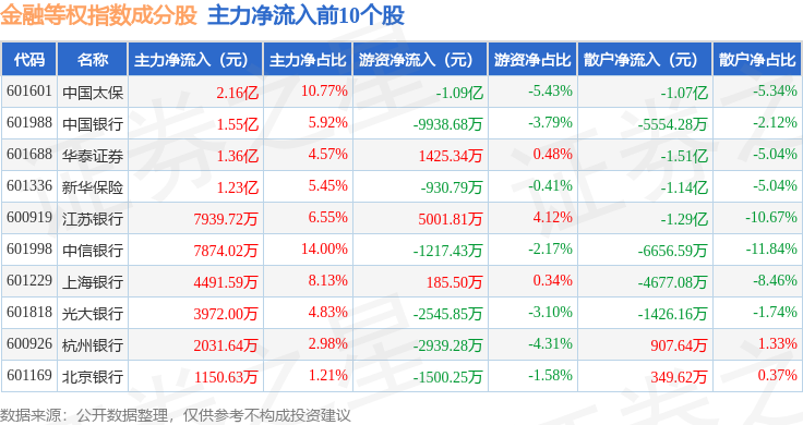 资金流向方面,金融等权(000076)指数成份股当日主力资金净流出合计26.54亿元,游资资金净流入合计7.74亿元,散户资金净流入合计18.81亿元。成份股资金流向详情见下表: