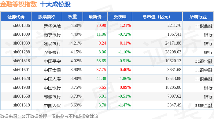 证券之星消息,10月30日,金融等权(000076)指数报收于5676.66点,跌0.42%,成交557.13亿元,换手率0.32%。当日该指数成份股中,上涨的有12家,中信银行以1.55%的涨幅领涨,下跌的有17家,中金公司以3.97%的跌幅领跌。