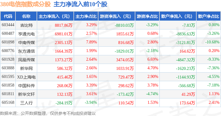 资金流向方面,380电信(000112)指数成份股当日主力资金净流出合计6.11亿元,游资资金净流入合计5769.94万元,散户资金净流入合计5.54亿元。成份股资金流向详情见下表: