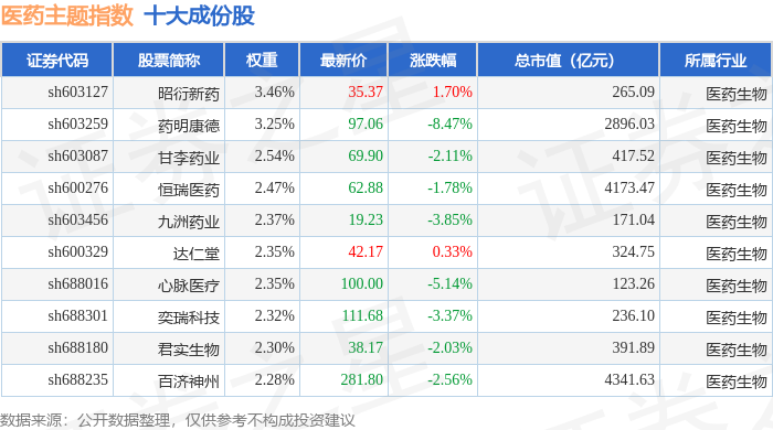 证券之星消息,10月30日,医药主题(000121)指数报收于8502.13点,跌1.45%,成交335.91亿元,换手率1.4%。当日该指数成份股中,上涨的有12家,润达医疗以4.55%的涨幅领涨,下跌的有38家,药明康德以8.47%的跌幅领跌。