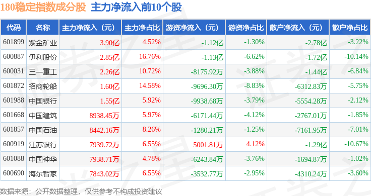 资金流向方面,180稳定(000125)指数成份股当日主力资金净流出合计47.28亿元,游资资金净流入合计14.08亿元,散户资金净流入合计33.19亿元。成份股资金流向详情见下表: