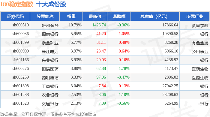 180稳定(000125)指数十大成份股详情如下: