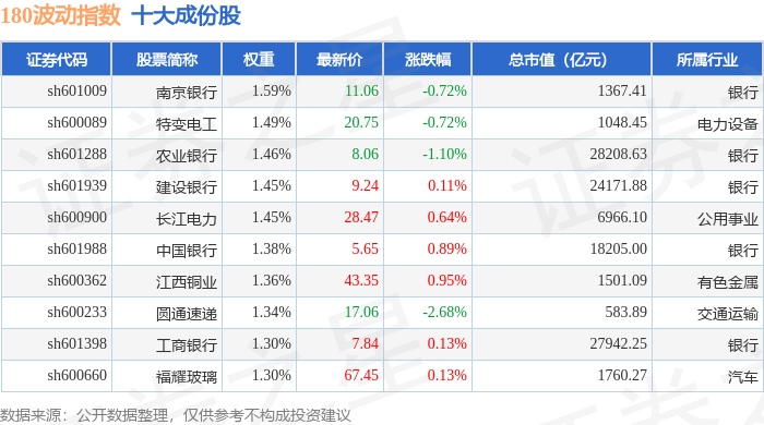 证券之星消息,10月30日,180波动(000129)指数报收于15514.72点,跌0.06%,成交1266.88亿元,换手率0.48%。当日该指数成份股中,上涨的有48家,中海油服以4.29%的涨幅领涨,下跌的有45家,正泰电器以5.32%的跌幅领跌。