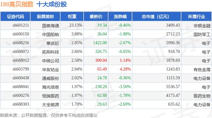 证券之星消息,10月30日,180高贝(000135)指数报收于6318.0点,跌1.08%,成交1810.02亿元,换手率1.26%。当日该指数成份股中,上涨的有12家,华友钴业以4.28%的涨幅领涨,下跌的有47家,药明康德以8.47%的跌幅领跌。