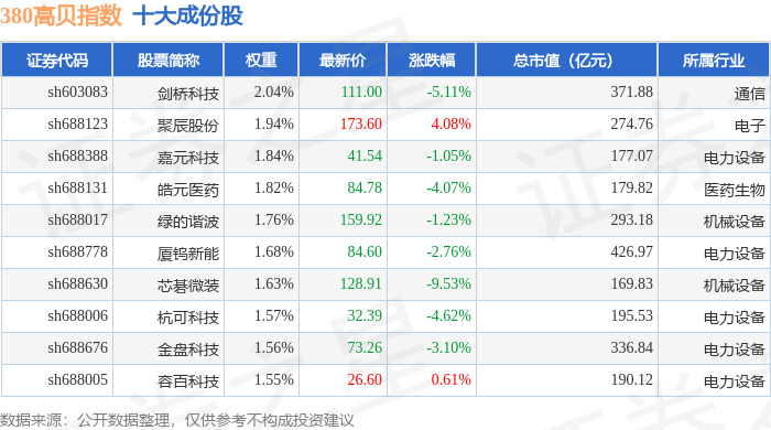 证券之星消息,10月30日,380高贝(000137)指数报收于5992.33点,跌1.96%,成交831.09亿元,换手率3.47%。当日该指数成份股中,上涨的有21家,固德威以4.51%的涨幅领涨,下跌的有79家,火炬电子以9.74%的跌幅领跌。