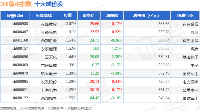 380稳定(000142)指数十大成份股详情如下: