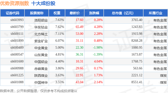 优势资源(000145)指数十大成份股详情如下: