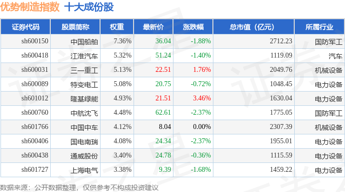 证券之星消息,10月30日,优势制造(000146)指数报收于7829.83点,跌0.9%,成交840.43亿元,换手率2.27%。当日该指数成份股中,上涨的有9家,阿特斯以9.5%的涨幅领涨,下跌的有39家,三星医疗以10.01%的跌幅领跌。